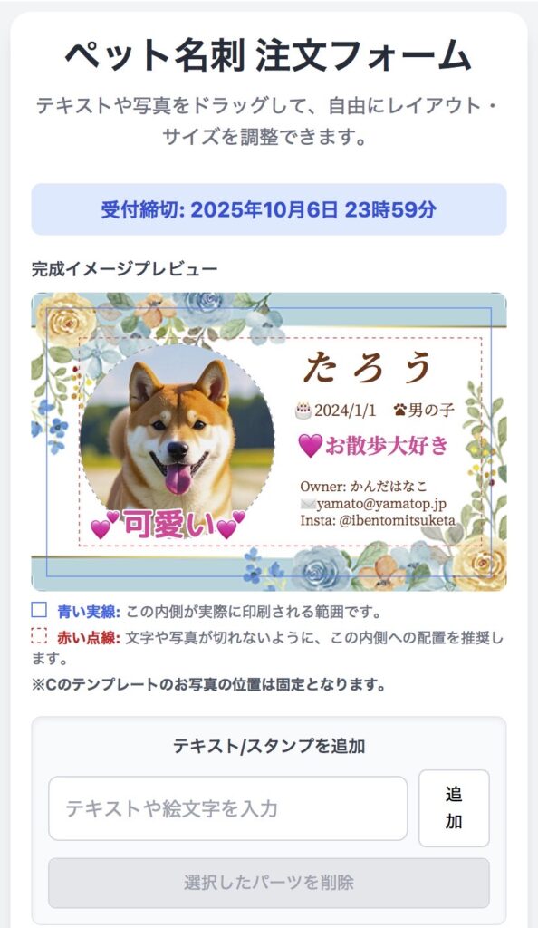 専門的なソフトは不要で、スマホやPCで下記の専用フォームからどなたでも直感的にワンちゃんのオリジナルグッズのデザインを作成できます。